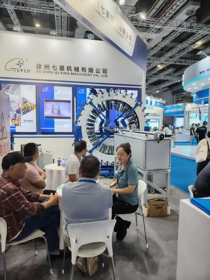 在本次展覽會(huì),徐州七星機(jī)械有限公司展出設(shè)備臥式110-48錠高速編織機(jī),復(fù)繞機(jī),內(nèi)曲面編織機(jī)。